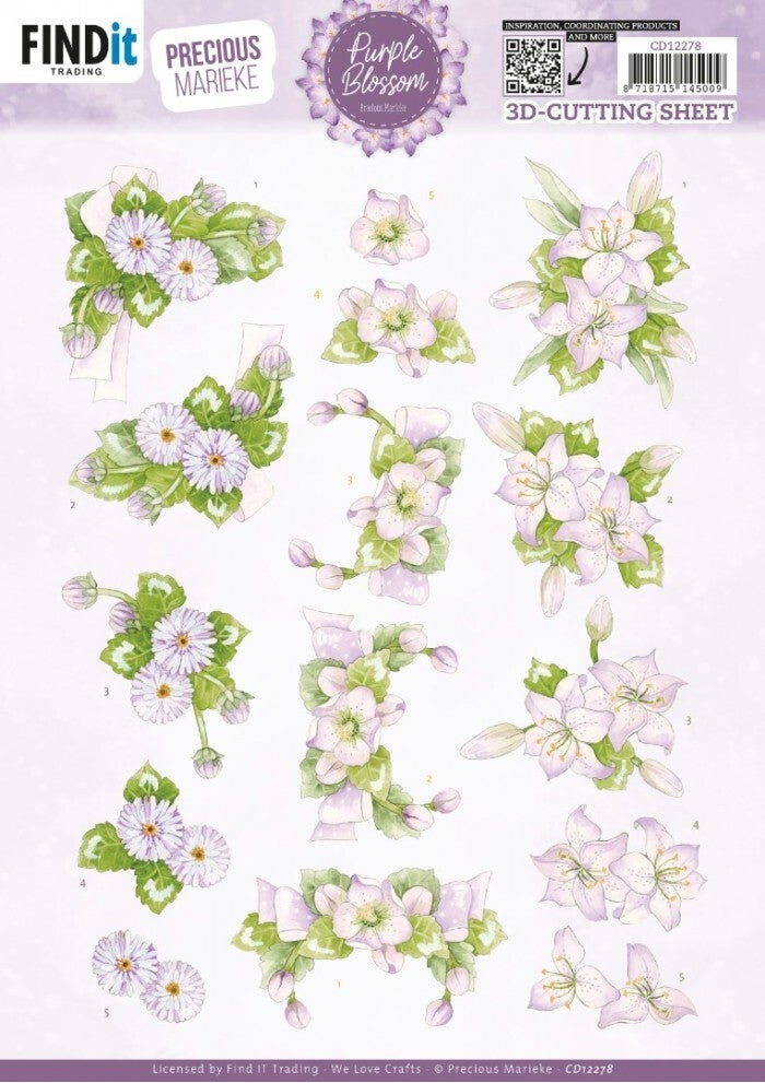 Knipvel met drie 3D-afbeeldingen in het thema van de collectie Purple Blossom van Precious Marieke.