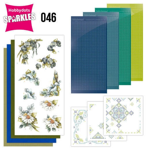 Deze handige set met Hobbydots-Sparkles bevat vier Sparkles stickervellen, drie oplegkaarten met patronen, drie 3D-afbeeldingen en drie vellen kaartkarton. Omdat het patroon in kleur is voorgedrukt op de oplegkaarten, kun je deze set gebruiken zonder Led Board.
