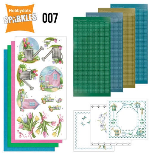 Deze handige set met Hobbydots-Sparkles bevat drie Sparkles stickervellen, drie oplegkaarten met patronen, drie 3D-afbeeldingen, drie vellen kaartkarton en 1 vel designpapier. Omdat het patroon in kleur is voorgedrukt op de oplegkaarten, kun je deze set gebruiken zonder Led Board.
