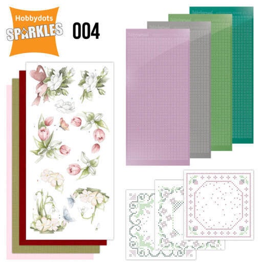 Deze handige set met Hobbydots-Sparkles bevat drie Sparkles stickervellen, drie oplegkaarten met patronen, drie 3D-afbeeldingen, drie vellen kaartkarton en 1 vel designpapier. Omdat het patroon in kleur is voorgedrukt op de oplegkaarten, kun je deze set gebruiken zonder Led Board.