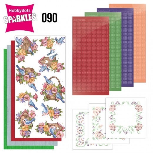 Deze set met Hobbydots-Sparkles bevat alle materialen voor 3 vierkante kaarten. De inhoud bestaat uit vier Sparkles stickervellen, drie 3D-afbeeldingen, drie witte oplegkaarten met bijpassende patronen en drie vellen kaartkarton. Het patroon is in kleur voorgedrukt op de oplegkaarten, waardoor je de stickers, zonder een Led Board te gebruiken, direct hierop kunt plakken.